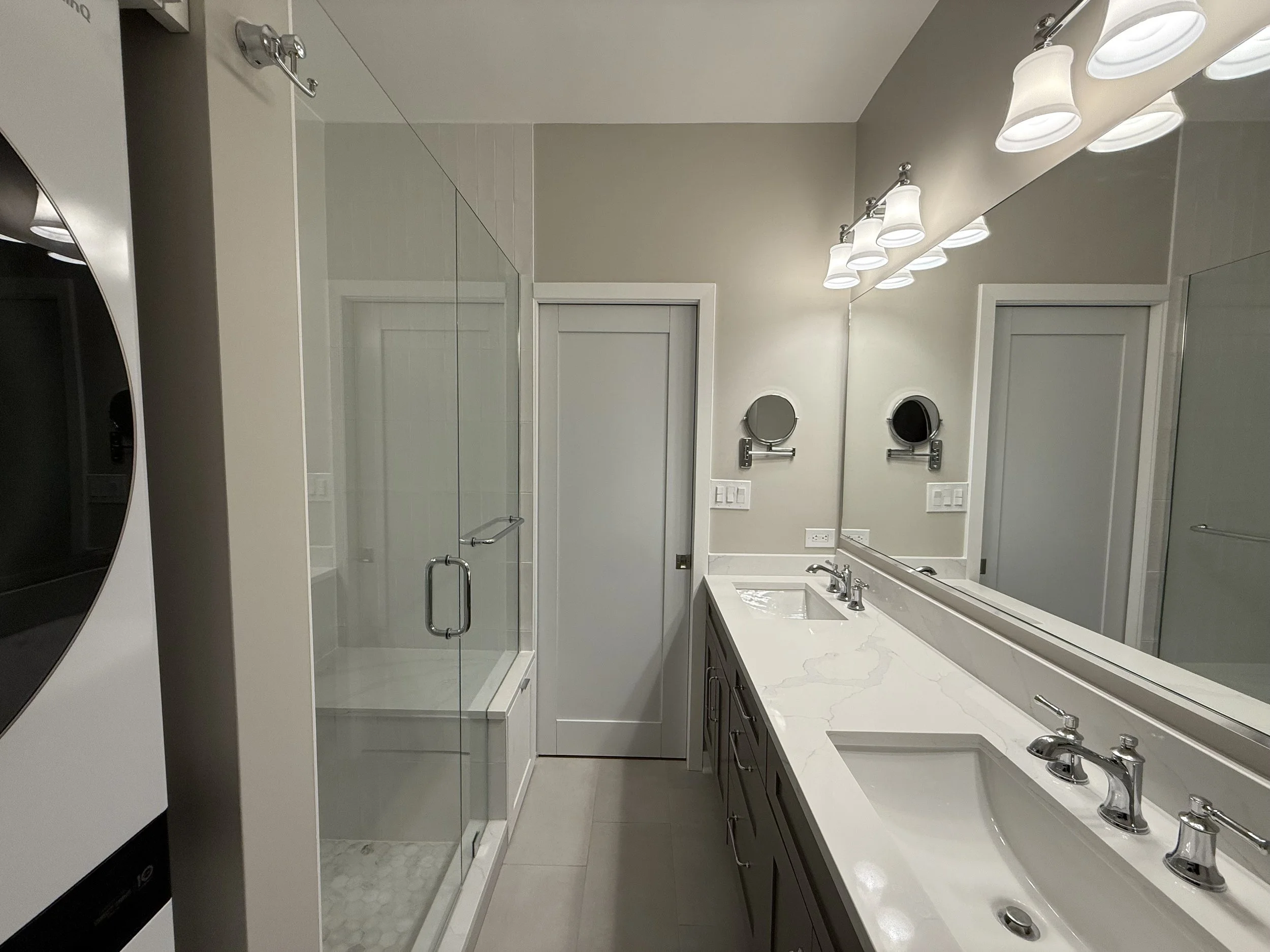 When it came to our primary bathroom, our goal was simple: create a space that works as hard as it looks. The original layout had a small shower, a large tub, and a Jack-and-Jill connection to the guest bedroom. We closed that off to craft a more private, spa-like primary bath, replaced the tub with a spacious walk-in shower, and moved the washer and dryer upstairs for everyday convenience.