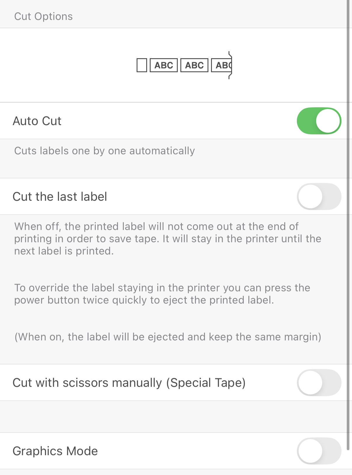 When you’re ready to print, toggle “Auto Cut” on and “Cut the last label” off. This will save tape.